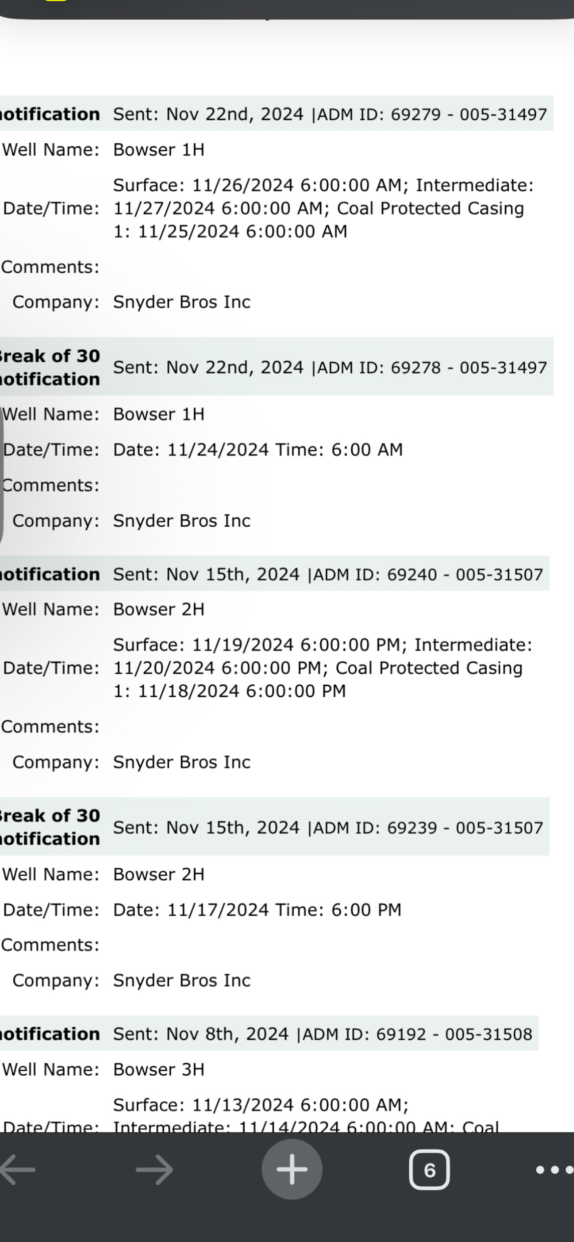 A ballpark answer is that long horizontals can take from four-five months to drill and complete. However when there are multiples from the same pad, they often drill them all first and then come back and do a zipper frac on all of them at once to save time time and money. So the drilling could take over a year, then several months to frac them all (there are 11 Bowser well permits.) Five go to the southeast and six go to the NW). After completion, it takes months to run the division order title opinion for the hundreds if not thousands of owners for the wells. Your state will have a statutory time frame which will require payment by a certain date after first sales. Many states are 120-180 days. So don’t look for payments for about 18-24 months from spud. Could be more, could be less, but certainly not “next week”. Throw in some weather delays due to winter and it could take longer.