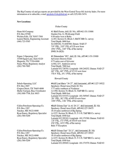 The Big Country oil and gas reports provide information from the West Central Texas Oil Activity Index on new drilling locations in Fisher, Howard, and Scurry Counties. Operators included Gunn Oil Company, Figure 3 Operating, LLC, Sabalo Operating,...