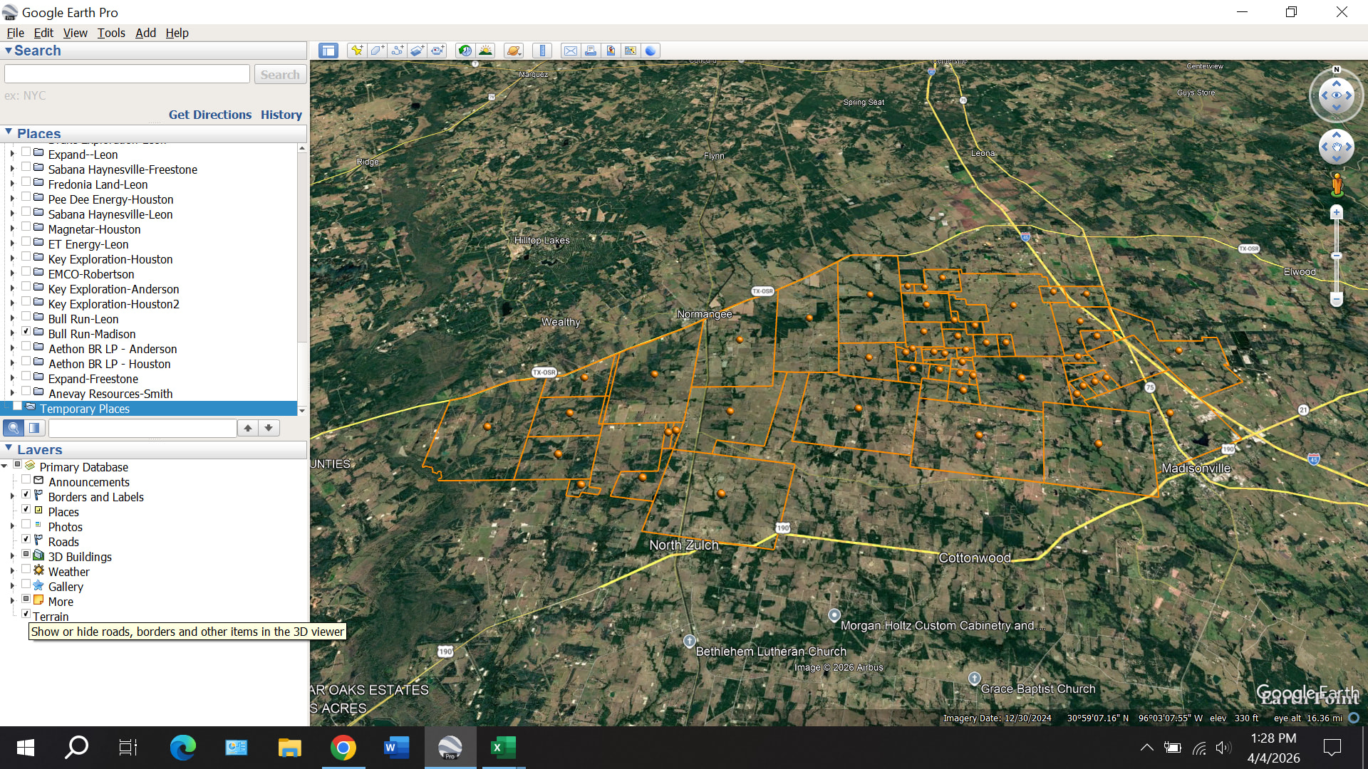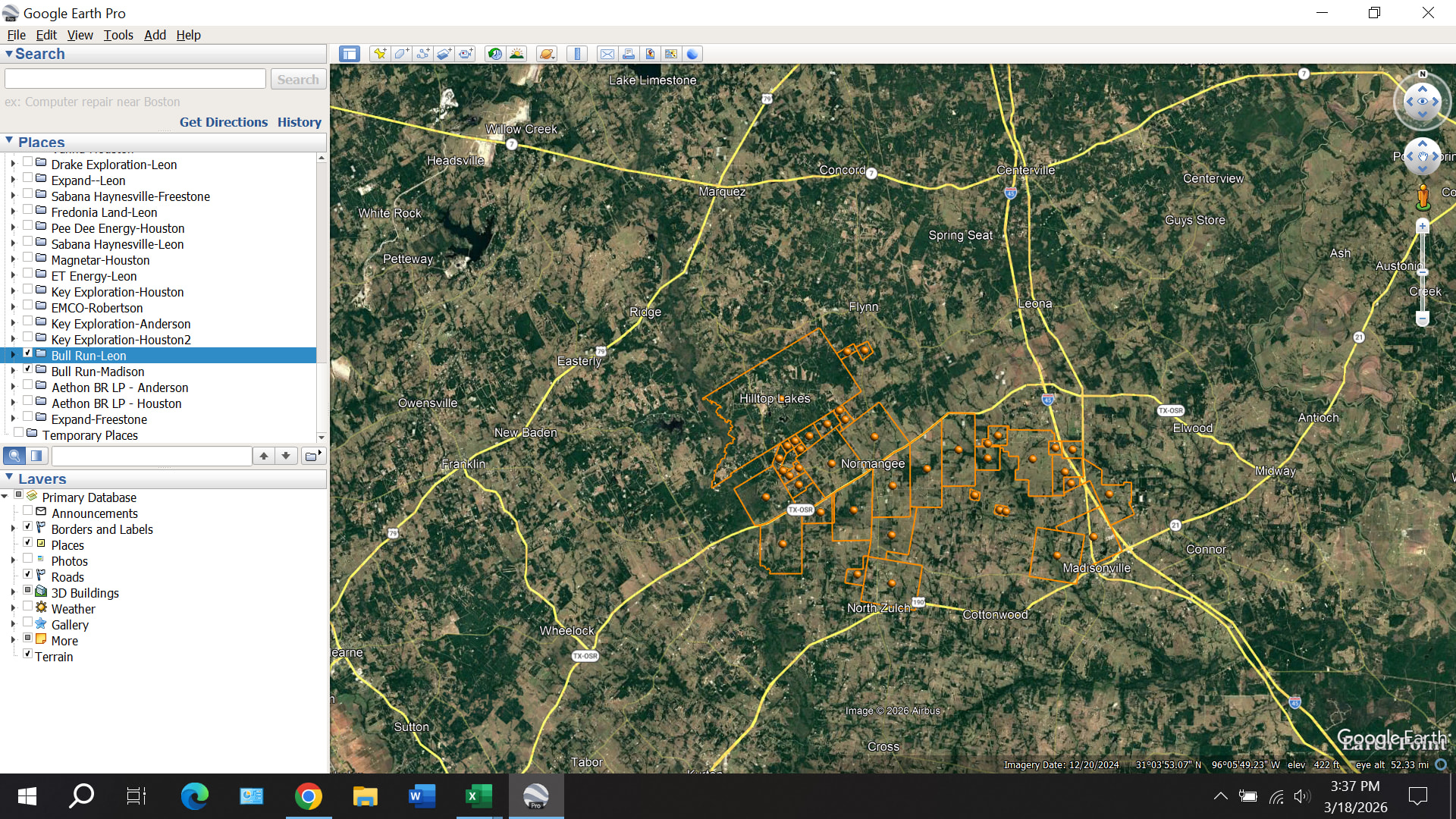 Bull Run Resources LLC (appears to be based in Tyler, Texas) filed 61 lease memos in Leon and Madison Counties on March 10. These leases cover about 7,600 acres (4,500 in Madison and 3,100 in Leon). The lease area extends from Madisonville to the northwest through Normangee up to Hilltop Lakes: