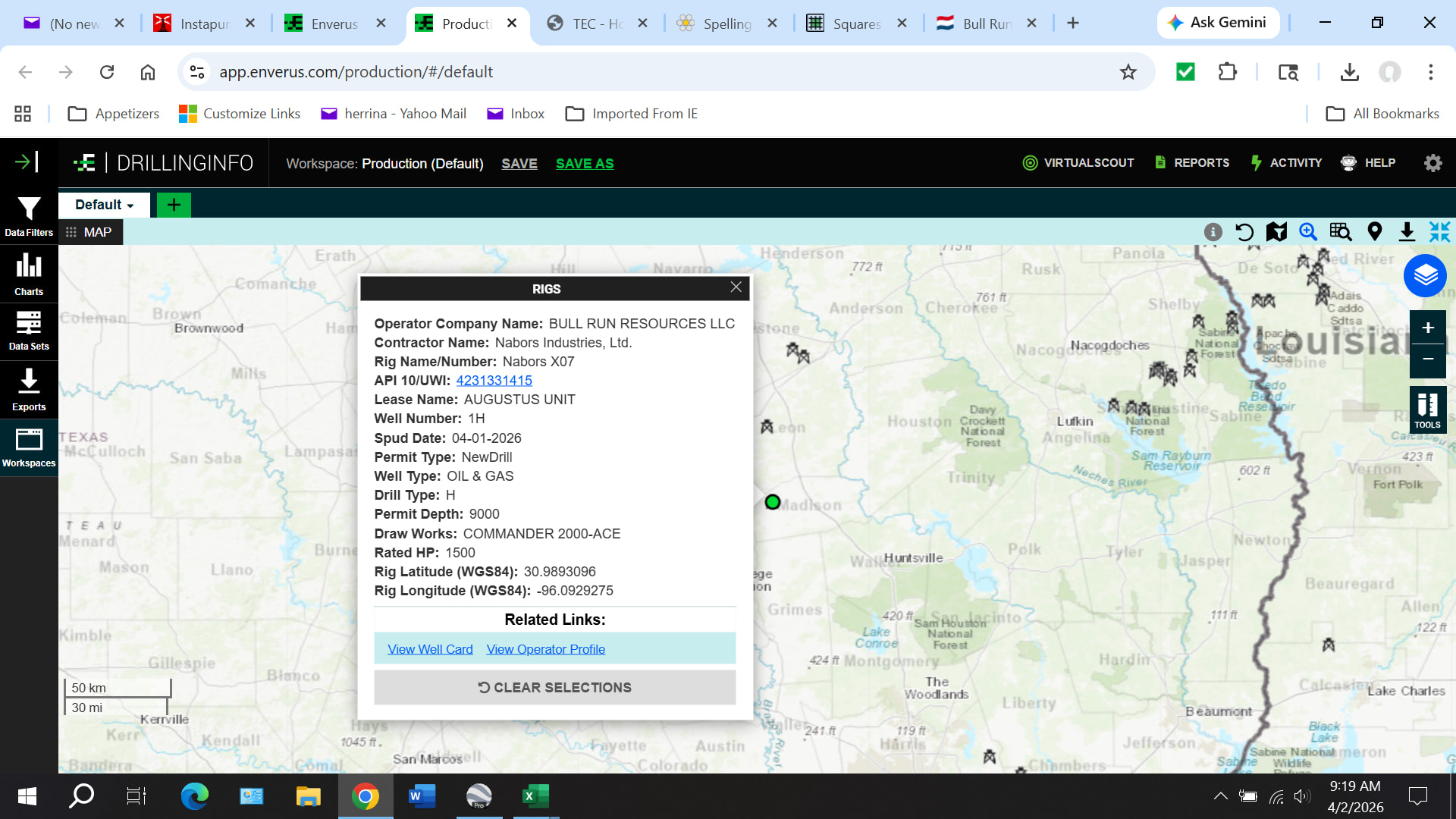 Rig is on site for the Bull Run Augustus Unit 1H well in Madison County. The rig is Nabors X07. EOG frequently uses Nabors rigs. In fact, EOG currently has nine Nabors rigs going. Just another piece of evidence suggesting that this is an EOG project.