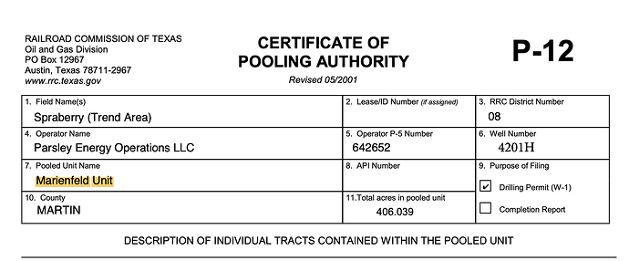 - 406.039- listed as P-12 total acreage for Marienfeld unit on the well location plat