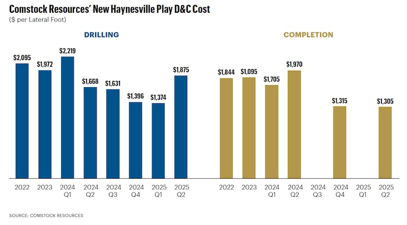 Comstock Resources has been paring D&C costs in its new Haynesville play that kicked off at $3,900 per lateral foot and varies quarterly by lateral length and formation depth. (Comstock Resources)