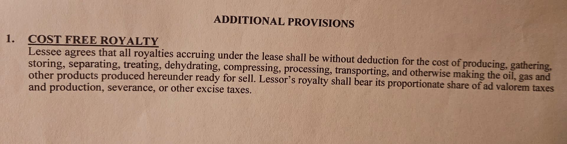 I do not see anything in the first Lease or Division Orders about Post Production Costs. They’re taking around 65% of the Revenue just for post production costs in areas listed in that lease. That’s definitely too high. Oil prices are not down enough to warrant 17 cents in Royalties on $130,000 with a 0.2 interest.