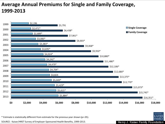 From 1999 to 2009, Kaiser found that the insurance premiums had climbed 131% or 13.1% per year, and workers’ contribution toward paying that premium jumped 128% or 12.8% per year. In 1999, workers’ average contribution to the premium was $1,543, and in 2009 it was $3,515. For employers, their contribution was $4,247 in 1999 and $9,860 in 2009. [5]