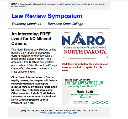 NARO just sent a notice about a free event for Mineral Owners in ND. Thought I would pass it along. It looks like it will be interesting. March 14 in Bismarck regarding the Missouri River/Lake Sakakawea area.