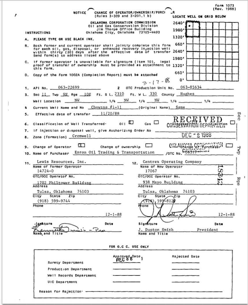 That well is late in life and has been through several owners. Lewis Resources, Centrex Operating Company and now Culbreath. Maybe more. There are several Chowins wells very close to this one. Another one is in Section 10, also owned by Culbreath.