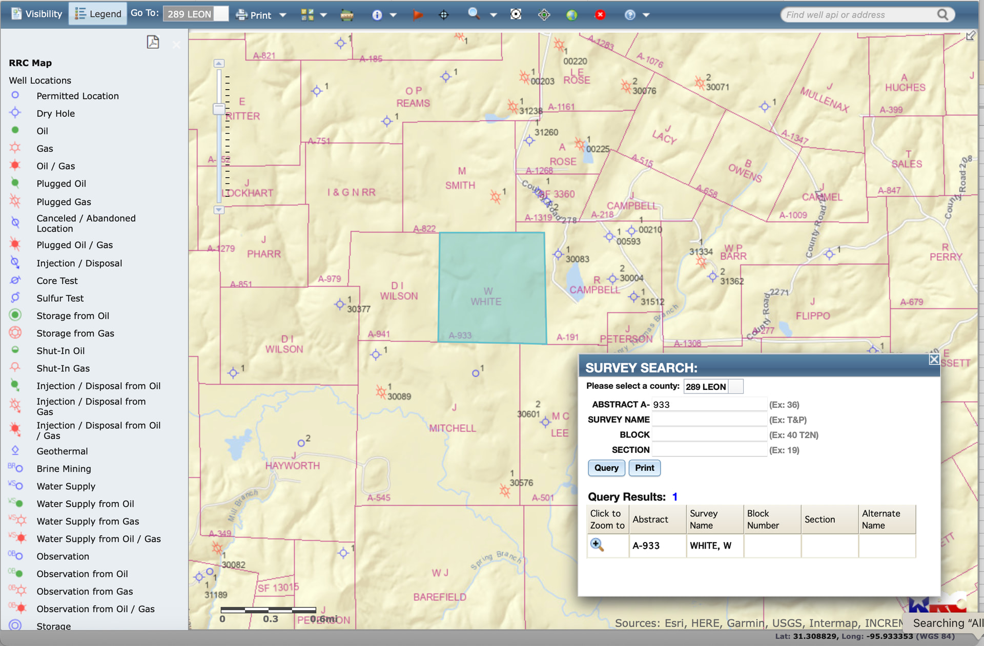 https://gis.rrc.texas.gov/GISViewer/ Select the county at the upper left and then use the blue magnifying glass near the middle of the top bar to get the drop down for surveys. You can zoom in to see wells, etc.