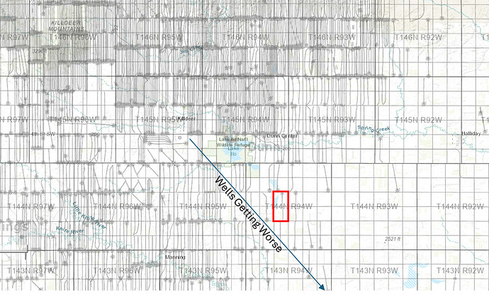 We see that folks are actually drilling some wells not that far from you. See two blue arrows. And those wells are better than the old wells there. However, the old wells in those areas are also about 50% better than the old wells in your area. So…one would guess newer wells in your area may not be as great (economic) and thus might not get drilled.