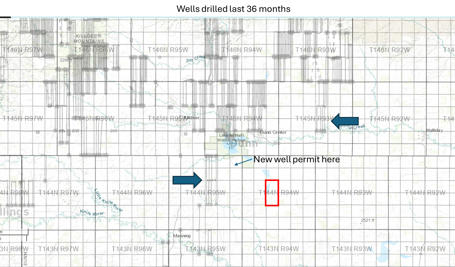 The units a good bit north of you are drilled up with 8-10 wells per 1280 acres. Where there are a lot of lines. Where you are, there is only one well per unit. Because the wells have not been very good. The Upper and Lower Bakken Shale are both on the order of 10-15’ thick here, there just isn’t a ton of oil generation. But wells in 144 94 made oil, each averaged about 220,000 bo. Which isn’t enough to drill a new well. BUT…if those wells were drilled and frac’d today, they would be better. If we look at just wells drilled in the last 3 years…
