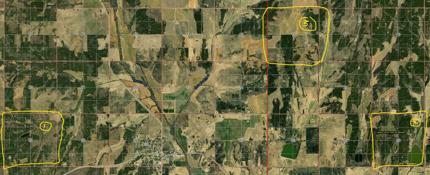 Here is an old Caddo county abstract map. You can keep a clean copy and make another copy and find your tracts on it. I make notes on mine in the margins. Caddo County OK old Abstract.pdf (490.6 KB)