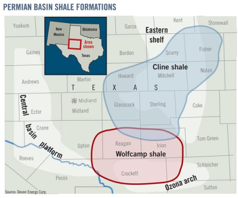In the past six months to a year, the talk about a newly discovered shale play in the West Texas region has been low key in comparison to the elections and supreme court cases, but oil and gas companies in the West Texas region are continuing to explore the Cline Shale play in hopes of what it contains. They are estimating that they have found the biggest shale formation in America, potentially [1]. The formation runs about 140 miles north and south and about 70 miles east to west [2]. Based on exploration in the region by Devon Energy, the estimates for recoverable reserves in the Cline Shale play could equate to as much as 30 billion barrels of oil [2]. To put this in perspective, the Eagle Ford has approximately 7 to 10 billion recoverable barrels and the Bakken shale has about 4.3 billion barrels of recoverable oil [2]. In fact some people in West Texas have been kicking the term “Saudi America” around to classify the West Texas region after hearing about the Cline Shale play’s potential [3]. It can be seen by the map below that the region the Cline shale encompasses is huge.