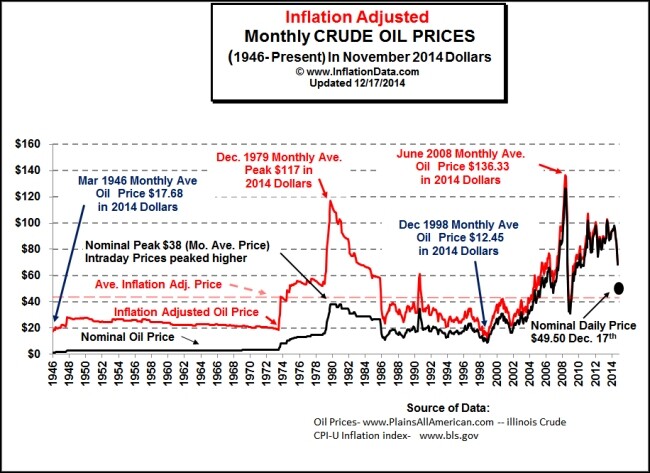 Before we start playing too loose with the actual oil prices, and start confusing people with misinformation, please check out the chart reference below, both in inflation adjusted and nominal prices for our benchmark crude, WTI. You will notice that it never went below $10 per bbl for much of the 80’s and 90’s. It did drop to $12 per bbl in 1999.