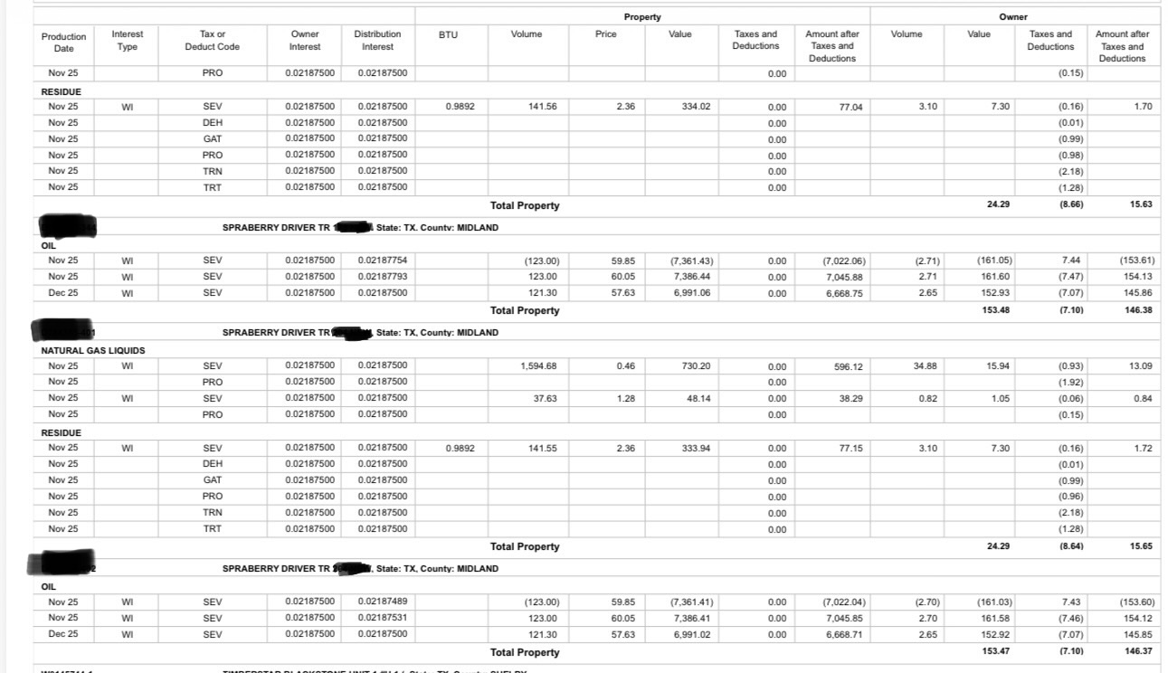 Sorry it is confusing and I probably wasn’t very clear on the revenue statement explanation either. So the actual revenue statement details show the name of the Unit and says Working Interest as the type of interest. I haven’t seen anything on a show a payment specifically for an ORRI or NRI. Only the WI working interest. It shows the Tract numbers that our interest involves in the Unit. Then it shows our share of the production and revenue after being divided down by our Tract participation factor and then it takes our NRI amount out of that resulting amount. That is how it was explained to me. Whether that is the correct method for calculating it or not I am not sure. It’s honestly a bit of a weird format for a revenue statement in my experience. But again I’m used to dealing with RI or ORRI interests. Let me see if I can crop a screen shot of a few lines of the statement and just blackout personal info to show you. Because I know it’s confusing and it’s hard to explain as well.